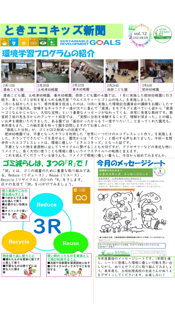 「ときエコキッズの日」に合わせ市内全園児に向け配布している、土岐紅陵高校の漫画研究部の生徒さんと共同制作した「メッセージシート」と、今月の環境学習プログラムの内容を新聞にまとめ紹介しますので、ぜひご覧ください。