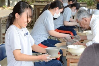 中学生活の記念にと泉中学校の3年生が地元の陶芸愛好家「陶寿会」の指導のもと、ろくろを使い茶わん作りに挑戦しました。ろくろを初めて使う生徒も多く、回転する土に苦戦しながら形を作り上げていきました。茶わんが出来上がると形が崩れないように慎重にろくろから外し、ほっとした表情を浮かべていました。